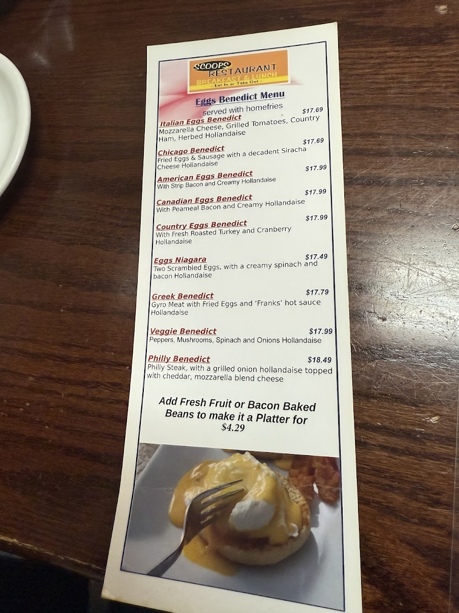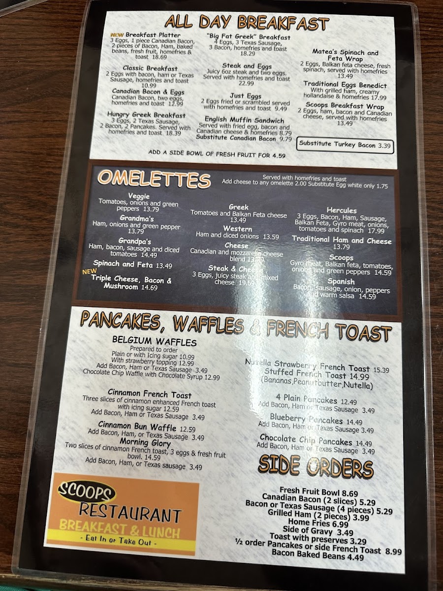 Typical meal times at Scoops lean toward leisurely weekend mornings and busy brunch hours, but the menu’s all-day breakfast options ensure those comforting flavors are available anytime. The presence of Canadian-inspired dishes like Canadian bacon, Canadian hash, and maple syrup adds a regional nod that feels both satisfying and down-to-earth.
