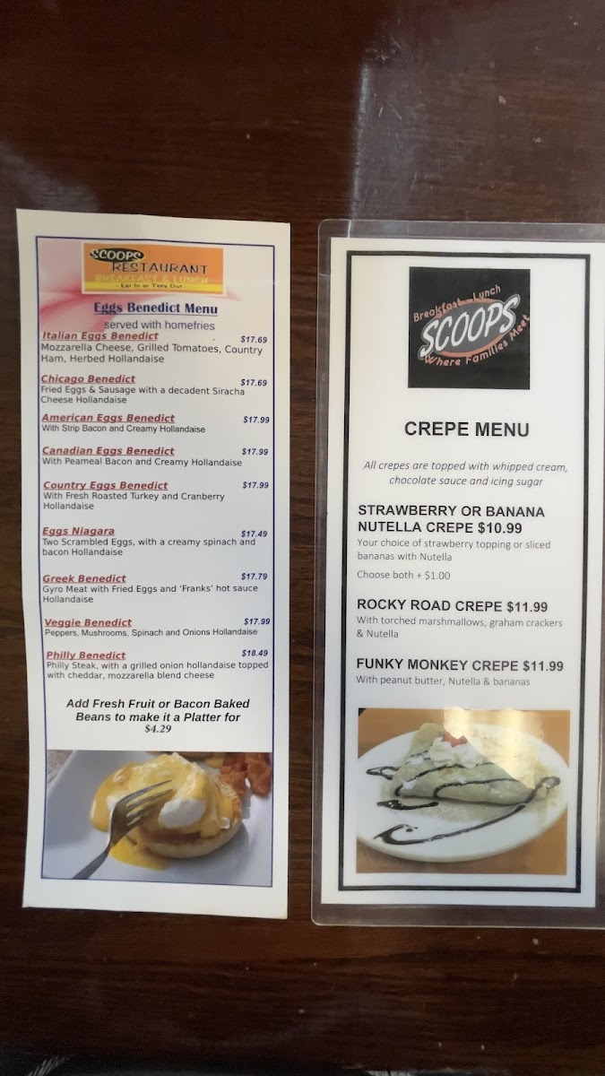 The menu at Scoops Restaurant Breakfast and Lunch offers a straightforward, comforting selection typical of a casual café setting. Here, you’ll find classic breakfast and brunch dishes alongside hearty lunch options that reflect a homey, inviting atmosphere. Whether you’re stopping by for an early morning coffee and a cinnamon French toast or dropping in later for a traditional eggs Benedict or an open-faced hot turkey sandwich, the menu serves familiar favorites with a welcoming touch.